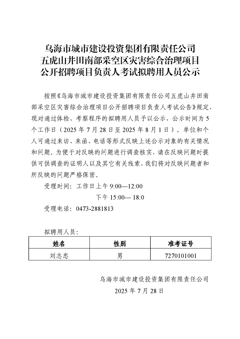 烏海市城市建設(shè)投資集團(tuán)有限責(zé)任公司五虎山井田南部采空區(qū)災(zāi)害綜合治理項(xiàng)目公開(kāi)招聘項(xiàng)目負(fù)責(zé)人考試擬聘用人員公示